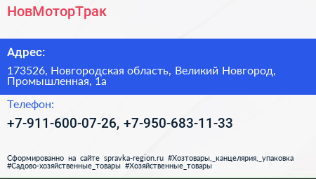 НовМоторТрак по адресу 173526, Новгородская область, Великий Новгород, Промышленная, 1а в дальнейшем Организация, размещена в следующих категориях:
