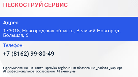 ПЕСКОСТРУЙ СЕРВИС по адресу 173018, Новгородская область, Великий Новгород, Большая, 6 в дальнейшем Организация, размещена в следующих категориях: