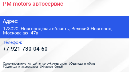 PM-motors, автосервис по адресу 173020, Новгородская область, Великий Новгород, Московская, 47в в дальнейшем Организация, размещена в следующих категориях:
