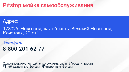 Pitstop, мойка самообслуживания по адресу 173025, Новгородская область, Великий Новгород, Кочетова, 20 ст1 в дальнейшем Организация, размещена в следующих категориях: