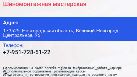 Шиномонтажная мастерская по адресу 173525, Новгородская область, Великий Новгород, Центральная, 96 в дальнейшем Организация, размещена в следующих категориях: