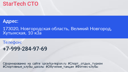 StarTech, СТО по адресу 173020, Новгородская область, Великий Новгород, Хутынская, 10 к3а в дальнейшем Организация, размещена в следующих категориях: