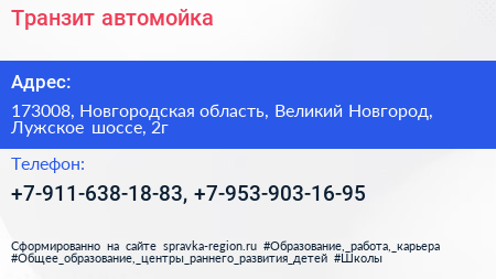 Транзит, автомойка по адресу 173008, Новгородская область, Великий Новгород, Лужское шоссе, 2г в дальнейшем Организация, размещена в следующих категориях: