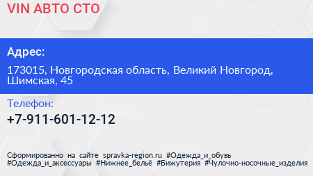 VIN-АВТО, СТО по адресу 173015, Новгородская область, Великий Новгород, Шимская, 45 в дальнейшем Организация, размещена в следующих категориях: