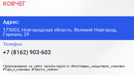 КОВЧЕГ по адресу 173003, Новгородская область, Великий Новгород, Германа, 29 в дальнейшем Организация, размещена в следующих категориях: