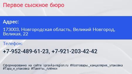 Первое сыскное бюро по адресу 173003, Новгородская область, Великий Новгород, Великая, 22 в дальнейшем Организация, размещена в следующих категориях: