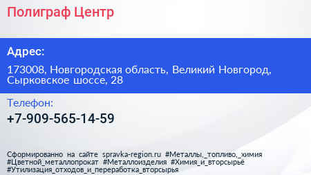 Полиграф Центр по адресу 173008, Новгородская область, Великий Новгород, Сырковское шоссе, 28 в дальнейшем Организация, размещена в следующих категориях: