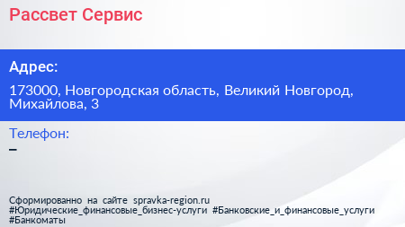 Рассвет Сервис по адресу 173000, Новгородская область, Великий Новгород, Михайлова, 3 в дальнейшем Организация, размещена в следующих категориях: