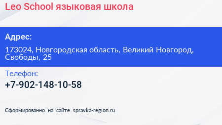 Leo School, языковая школа по адресу 173024, Новгородская область, Великий Новгород, Свободы, 25 в дальнейшем Организация, размещена в следующих категориях: