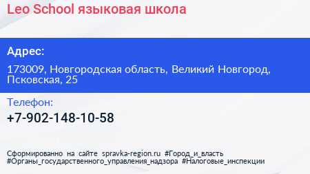 Leo School, языковая школа по адресу 173009, Новгородская область, Великий Новгород, Псковская, 25 в дальнейшем Организация, размещена в следующих категориях: