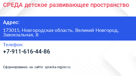 СРЕДА, детское развивающее пространство по адресу 173015, Новгородская область, Великий Новгород, Завокзальная, 8 в дальнейшем Организация, размещена в следующих категориях: