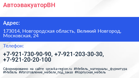 АвтоэвакуаторВН по адресу 173014, Новгородская область, Великий Новгород, Московская, 24 в дальнейшем Организация, размещена в следующих категориях: