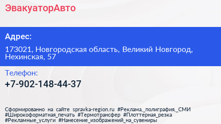 ЭвакуаторАвто по адресу 173021, Новгородская область, Великий Новгород, Нехинская, 57 в дальнейшем Организация, размещена в следующих категориях: