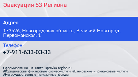 Эвакуация 53 Региона по адресу 173526, Новгородская область, Великий Новгород, Первомайская, 1 в дальнейшем Организация, размещена в следующих категориях:
