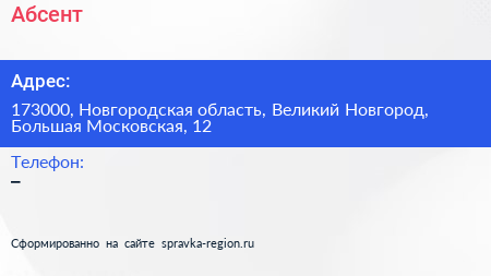 Абсент по адресу 173000, Новгородская область, Великий Новгород, Большая Московская, 12 в дальнейшем Организация, размещена в следующих категориях: