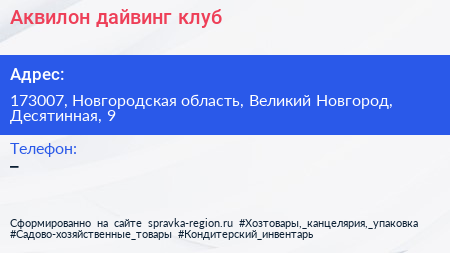 Аквилон, дайвинг-клуб по адресу 173007, Новгородская область, Великий Новгород, Десятинная, 9 в дальнейшем Организация, размещена в следующих категориях: