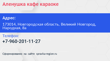 Аленушка, кафе-караоке по адресу 173014, Новгородская область, Великий Новгород, Народная, 8а в дальнейшем Организация, размещена в следующих категориях: