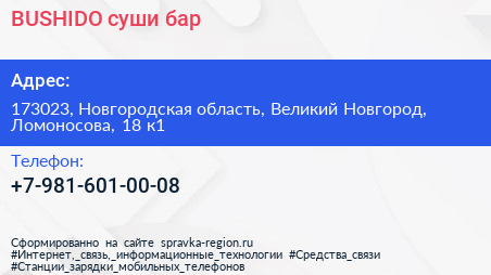 BUSHIDO, суши-бар по адресу 173023, Новгородская область, Великий Новгород, Ломоносова, 18 к1 в дальнейшем Организация, размещена в следующих категориях:
