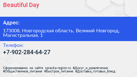 Beautiful Day по адресу 173008, Новгородская область, Великий Новгород, Магистральная, 1 в дальнейшем Организация, размещена в следующих категориях: