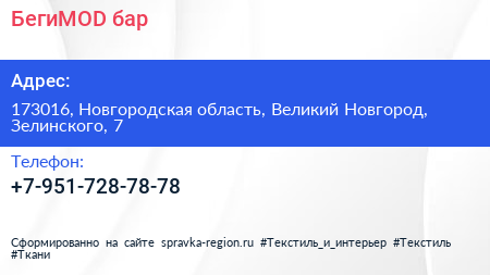 БегиMOD, бар по адресу 173016, Новгородская область, Великий Новгород, Зелинского, 7 в дальнейшем Организация, размещена в следующих категориях: