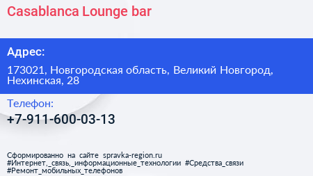 Casablanca Lounge bar по адресу 173021, Новгородская область, Великий Новгород, Нехинская, 28 в дальнейшем Организация, размещена в следующих категориях: