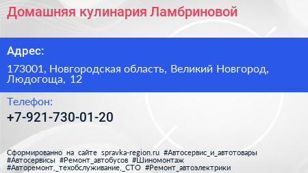 Домашняя кулинария Ламбриновой по адресу 173001, Новгородская область, Великий Новгород, Людогоща, 12 в дальнейшем Организация, размещена в следующих категориях: