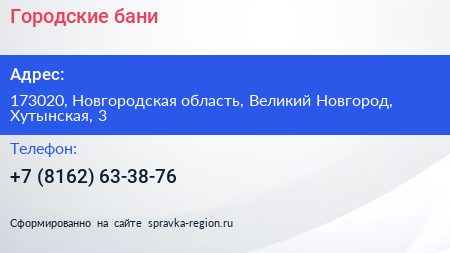 Городские бани по адресу 173020, Новгородская область, Великий Новгород, Хутынская, 3 в дальнейшем Организация, размещена в следующих категориях:
