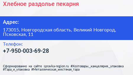 Хлебное раздолье, пекарня по адресу 173015, Новгородская область, Великий Новгород, Псковская, 11 в дальнейшем Организация, размещена в следующих категориях: