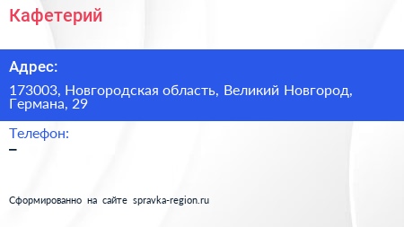 Кафетерий по адресу 173003, Новгородская область, Великий Новгород, Германа, 29 в дальнейшем Организация, размещена в следующих категориях: