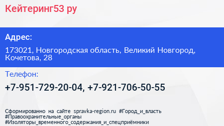 Кейтеринг53.ру по адресу 173021, Новгородская область, Великий Новгород, Кочетова, 28 в дальнейшем Организация, размещена в следующих категориях: