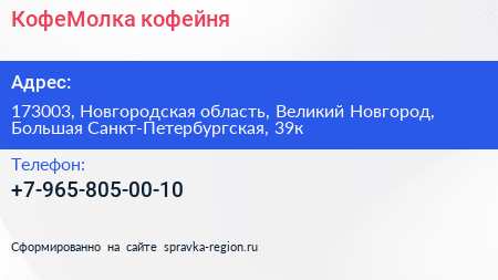 КофеМолка, кофейня по адресу 173003, Новгородская область, Великий Новгород, Большая Санкт-Петербургская, 39к в дальнейшем Организация, размещена в следующих категориях: