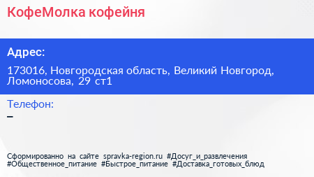 КофеМолка, кофейня по адресу 173016, Новгородская область, Великий Новгород, Ломоносова, 29 ст1 в дальнейшем Организация, размещена в следующих категориях: