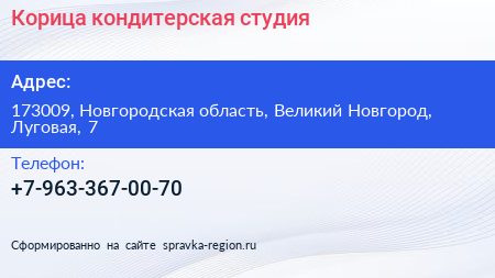 Корица, кондитерская студия по адресу 173009, Новгородская область, Великий Новгород, Луговая, 7 в дальнейшем Организация, размещена в следующих категориях: