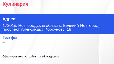 Кулинария по адресу 173016, Новгородская область, Великий Новгород, проспект Александра Корсунова, 18 в дальнейшем Организация, размещена в следующих категориях: