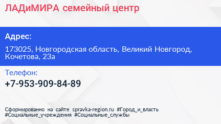 ЛАДиМИРА, семейный центр по адресу 173025, Новгородская область, Великий Новгород, Кочетова, 23а в дальнейшем Организация, размещена в следующих категориях: