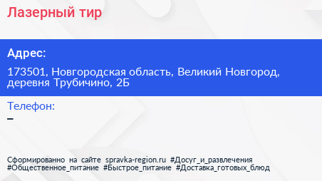 Лазерный тир по адресу 173501, Новгородская область, Великий Новгород, деревня Трубичино, 2Б в дальнейшем Организация, размещена в следующих категориях:
