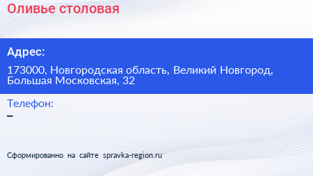 Оливье, столовая по адресу 173000, Новгородская область, Великий Новгород, Большая Московская, 32 в дальнейшем Организация, размещена в следующих категориях: