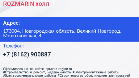ROZMARIN холл по адресу 173004, Новгородская область, Великий Новгород, Молотковская, 4 в дальнейшем Организация, размещена в следующих категориях:
