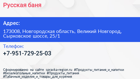 Русская баня по адресу 173008, Новгородская область, Великий Новгород, Сырковское шоссе, 25/1 в дальнейшем Организация, размещена в следующих категориях:
