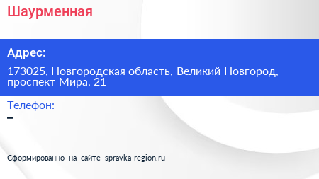Шаурменная по адресу 173025, Новгородская область, Великий Новгород, проспект Мира, 21 в дальнейшем Организация, размещена в следующих категориях: