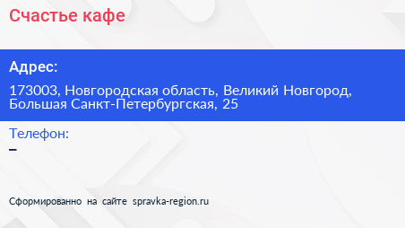 Счастье, кафе по адресу 173003, Новгородская область, Великий Новгород, Большая Санкт-Петербургская, 25 в дальнейшем Организация, размещена в следующих категориях: