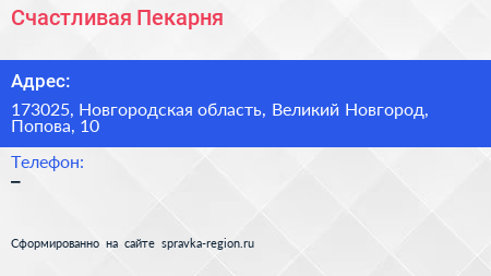 Счастливая Пекарня по адресу 173025, Новгородская область, Великий Новгород, Попова, 10 в дальнейшем Организация, размещена в следующих категориях: