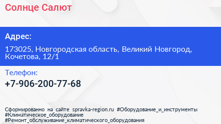 Солнце Салют по адресу 173025, Новгородская область, Великий Новгород, Кочетова, 12/1 в дальнейшем Организация, размещена в следующих категориях: