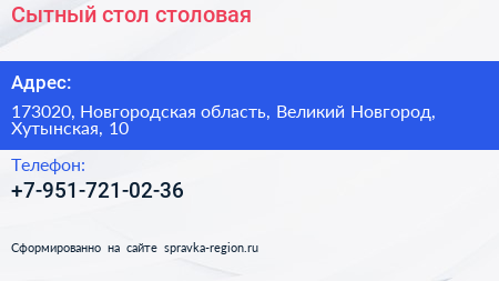 Сытный стол, столовая по адресу 173020, Новгородская область, Великий Новгород, Хутынская, 10 в дальнейшем Организация, размещена в следующих категориях: