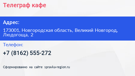 Телеграф, кафе по адресу 173001, Новгородская область, Великий Новгород, Людогоща, 2 в дальнейшем Организация, размещена в следующих категориях: