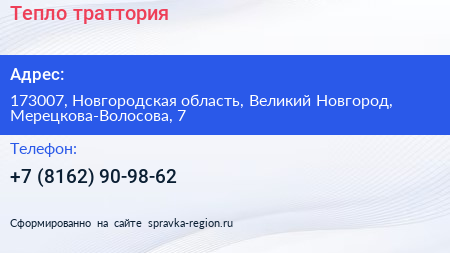 Тепло, траттория по адресу 173007, Новгородская область, Великий Новгород, Мерецкова-Волосова, 7 в дальнейшем Организация, размещена в следующих категориях: