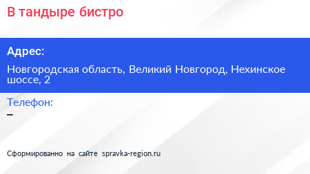 В тандыре, бистро по адресу Новгородская область, Великий Новгород, Нехинское шоссе, 2 в дальнейшем Организация, размещена в следующих категориях: