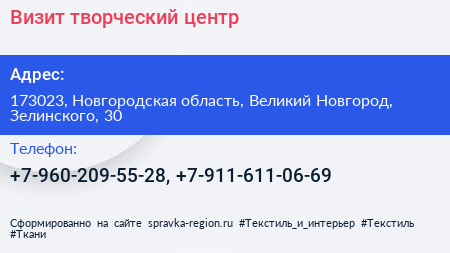 Визит, творческий центр по адресу 173023, Новгородская область, Великий Новгород, Зелинского, 30 в дальнейшем Организация, размещена в следующих категориях: