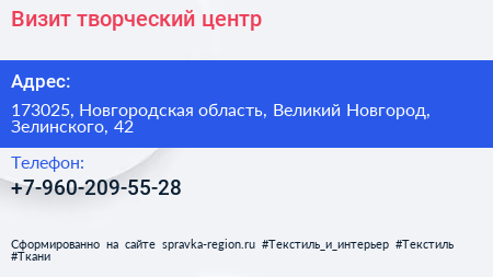 Визит, творческий центр по адресу 173025, Новгородская область, Великий Новгород, Зелинского, 42 в дальнейшем Организация, размещена в следующих категориях: