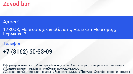 Zavod bar по адресу 173003, Новгородская область, Великий Новгород, Германа, 2 в дальнейшем Организация, размещена в следующих категориях: